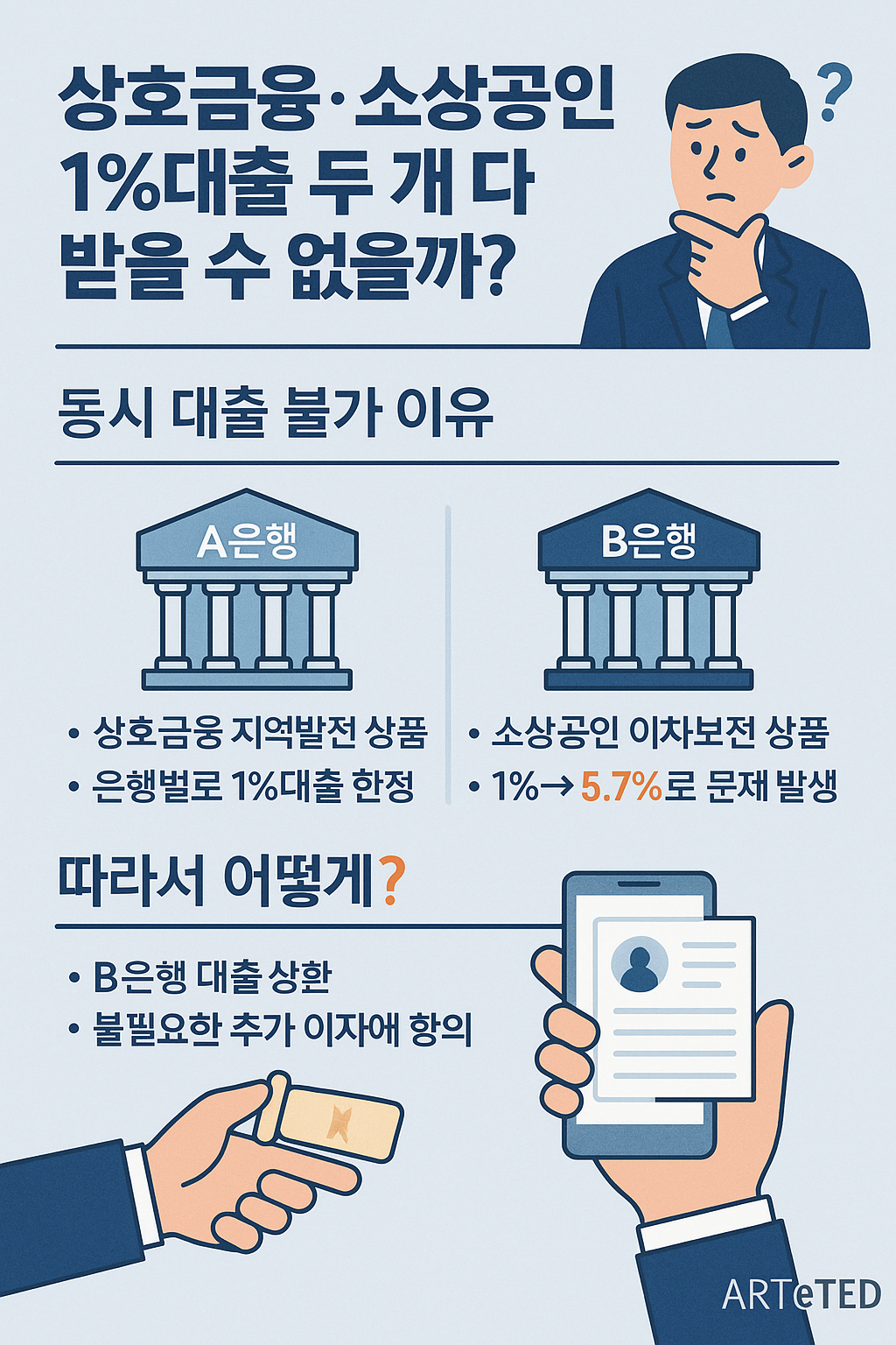 상호금융 지역발전대출, 소상공인 1% 이자차액보전 등은 국가 또는 지자체 재정지원 사업입니다. 이런 정책성 금리지원은 동일 차주에게 중복 적용이 불가하며, 은행은 대출 실행 전 중복 여부 조회 및 고객 고지 의무를 가집니다.