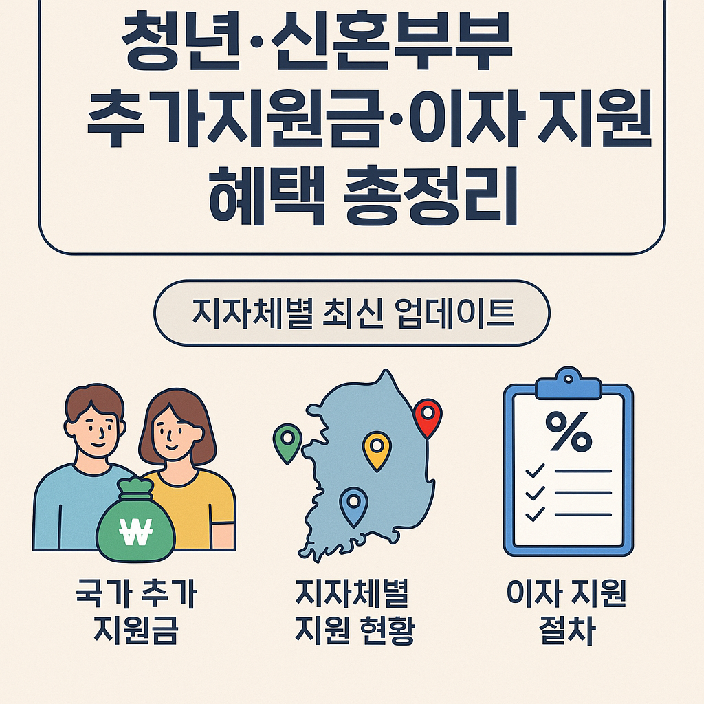 2025년 청년·신혼부부가 받을 수 있는 추가지원금·이자 보전 혜택을 한눈에 정리했습니다. 서울·경기·인천·부산 등 지자체별 프로그램과 신청 절차, 필수 서류, 승인률 높이는 팁까지 꼼꼼히 담았습니다.