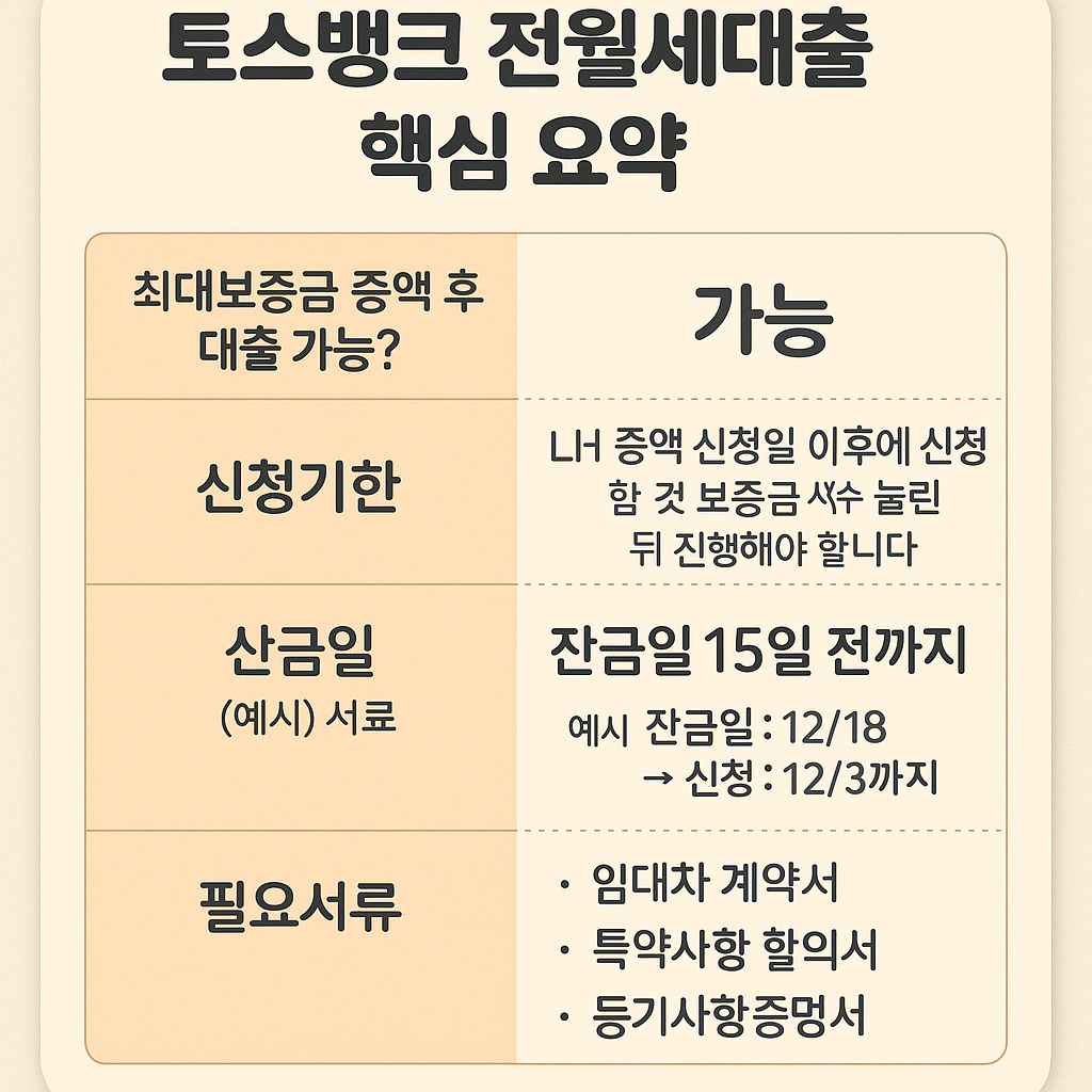 - 대출 신청 시한: 토스뱅크 전월세대출은 잔금일 기준 15일 이전까지 접수(영업일 고려).